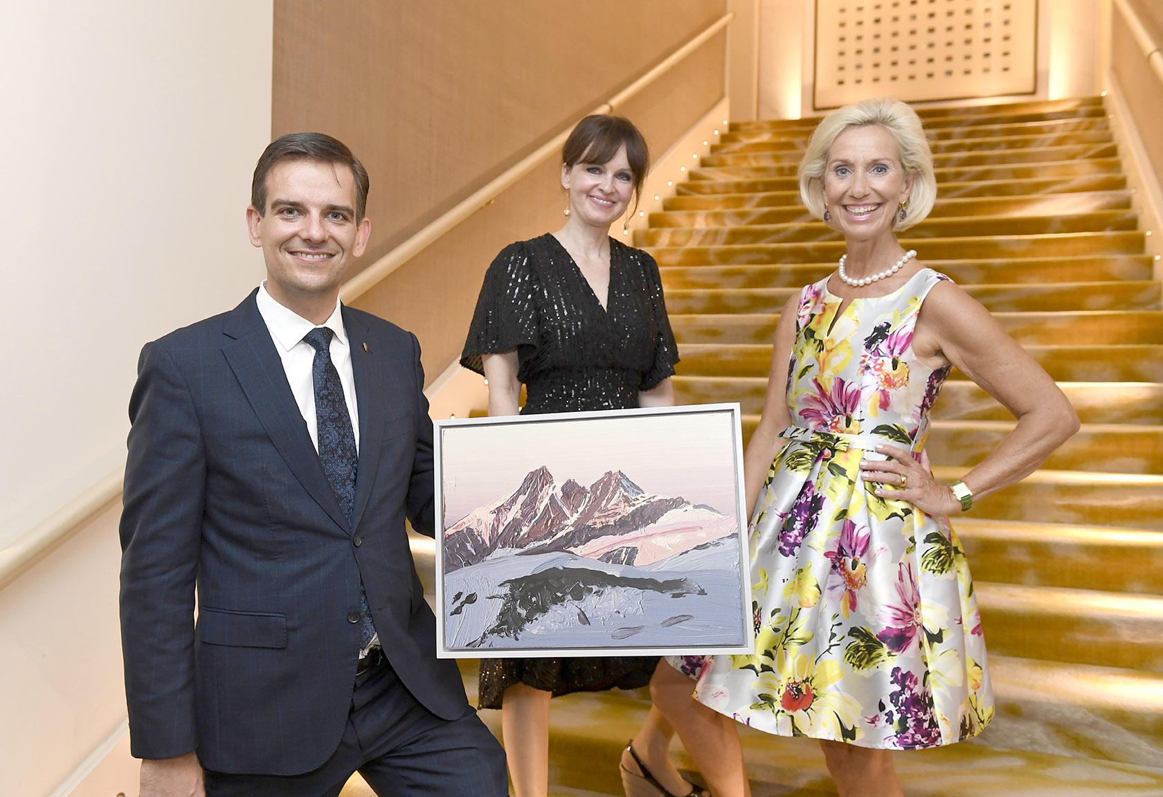 Sonja Lechner, Kristina Tröger (Präsidentin Club europäischer Unternehmerinnen), Dominik Reiner (Generalmanager Hotel Mandarin Oriental München) / Empfang und Vortrag: „Das Tor zu den Alpen – der Münchner Künstler Felix Rehfeld bereichert das renovierte Mandarin Oriental“ / CEU – Club europäischer Unternehmerinnen e.V. / München / 16. September 2020 / Bitte Fotovermerk: Agentur Schneider-Press/Frank Rollitz
