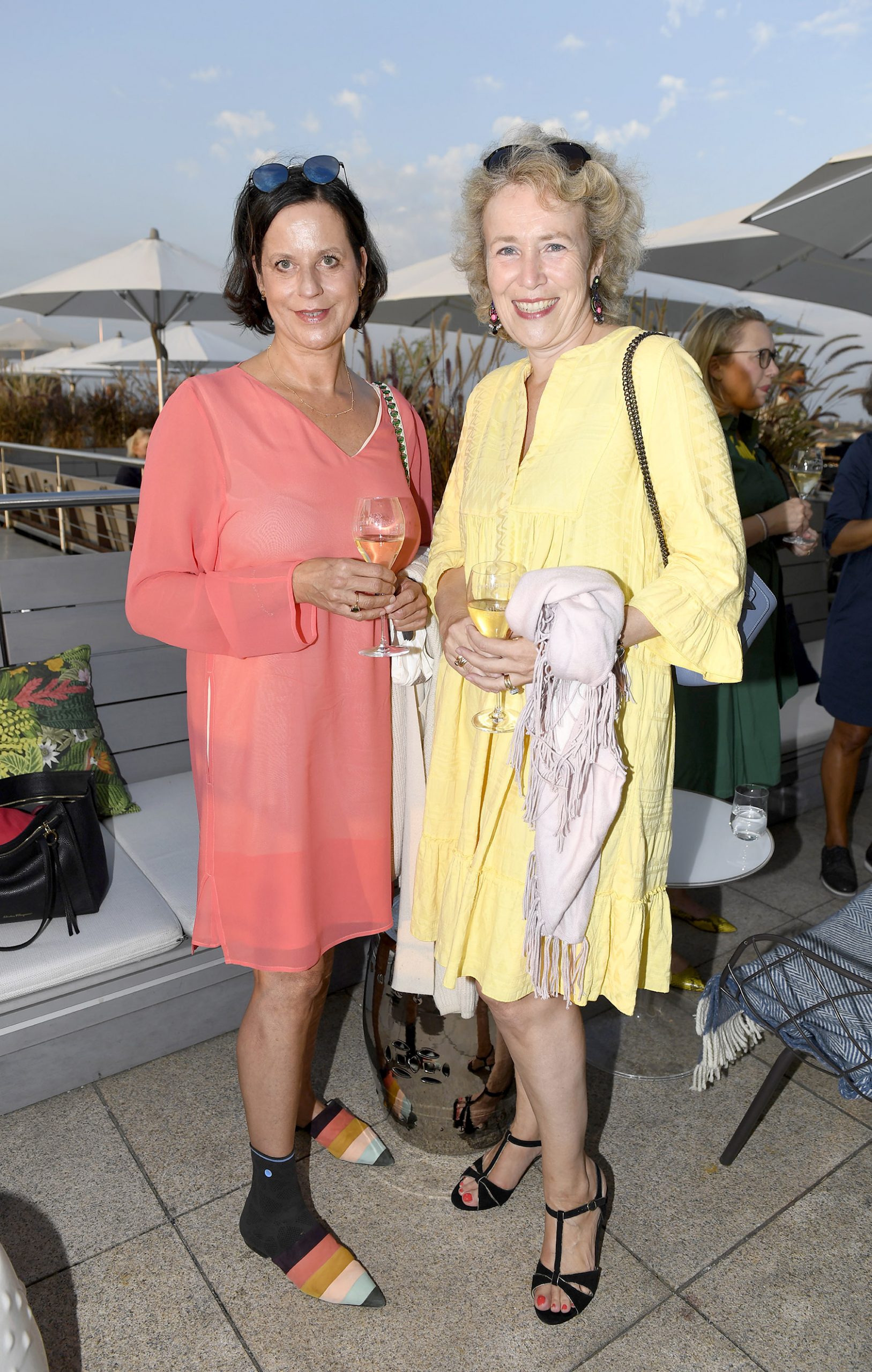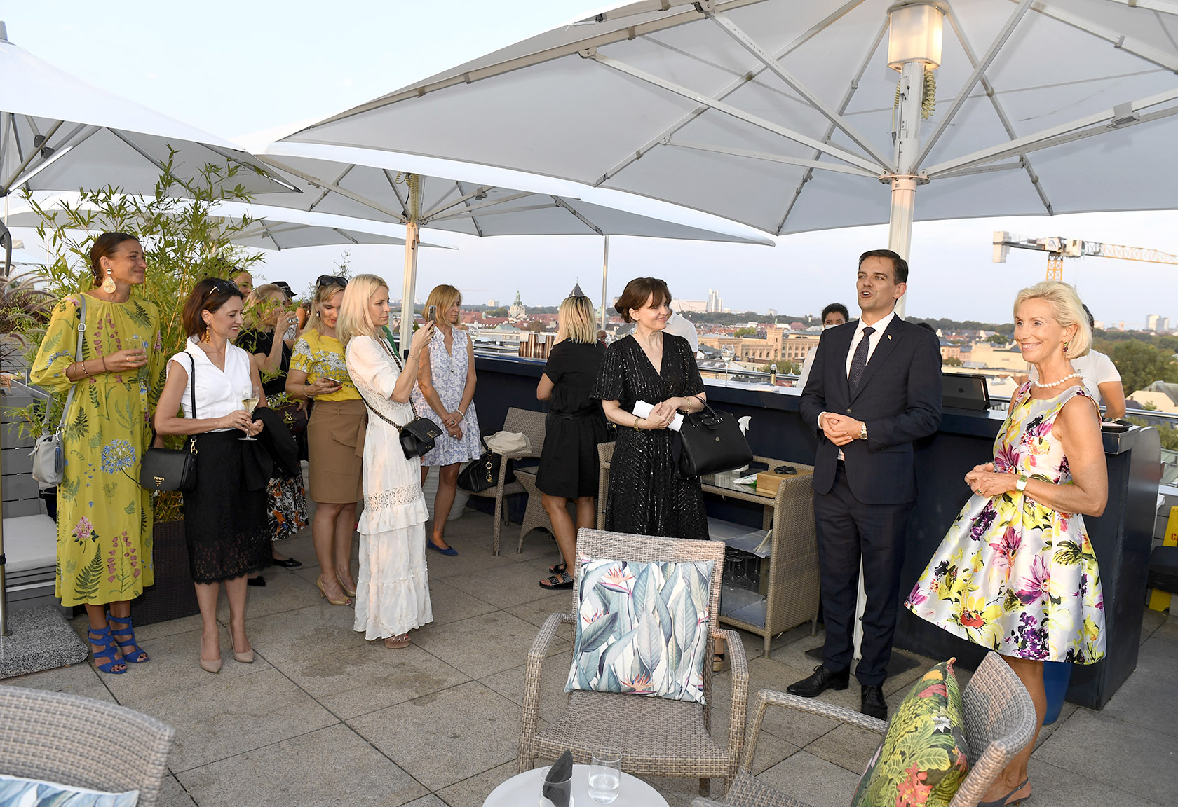 Gäste auf der Terrasse / Empfang und Vortrag: „Das Tor zu den Alpen – der Münchner Künstler Felix Rehfeld bereichert das renovierte Mandarin Oriental“ / CEU – Club europäischer Unternehmerinnen e.V. / München / 16. September 2020 / Bitte Fotovermerk: Agentur Schneider-Press/Frank Rollitz