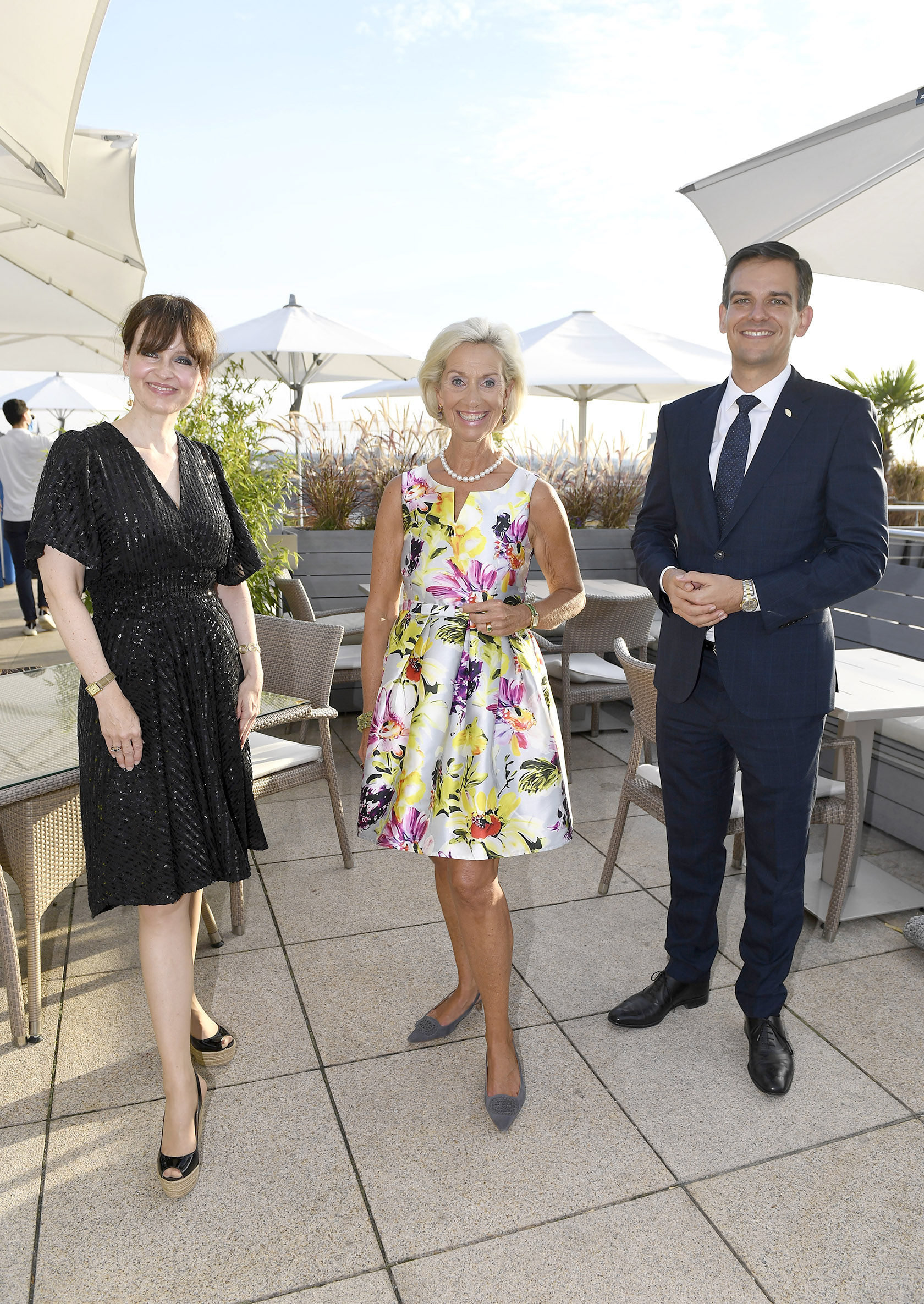 Kristina Tröger (Präsidentin Club europäischer Unternehmerinnen), Dominik Reiner (Generalmanager Hotel Mandarin Oriental München) und Sonja Lechner / Empfang und Vortrag: „Das Tor zu den Alpen – der Münchner Künstler Felix Rehfeld bereichert das renovierte Mandarin Oriental“ / CEU – Club europäischer Unternehmerinnen e.V. / München / 16. September 2020 / Bitte Fotovermerk: Agentur Schneider-Press/Frank Rollitz